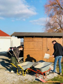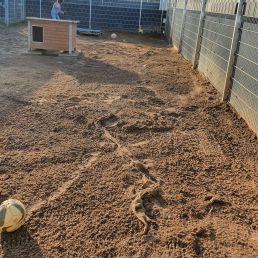 Gestern wurde das gute Wetter genutzt um die Löcher auf unserem Parkplatz zu flicken und die Ausläufe weiter mit Sand zu bestücken, damit beim nächsten Regen die Hunde nicht wieder in der Matsche stehen.