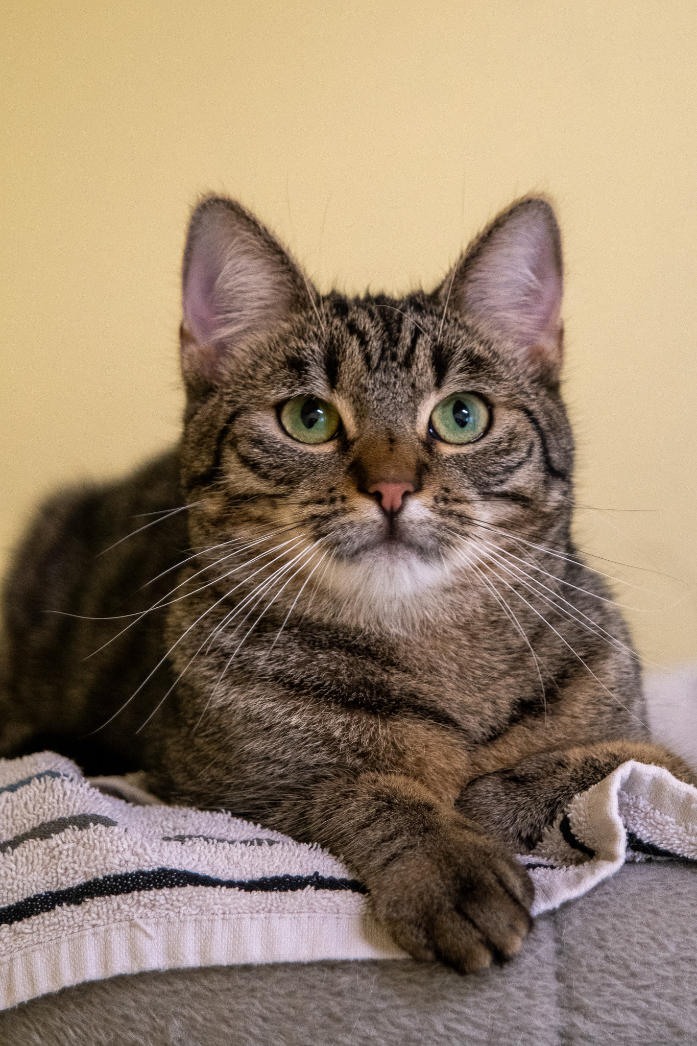 Crispy kam als Fundkatze aus Stemwede zu uns. Sie ist anfangs sehr zurückhaltend und schüchtern. Mit anderen Katzen hat sie keine Probleme, ist aber auch da eher vorsichtig.